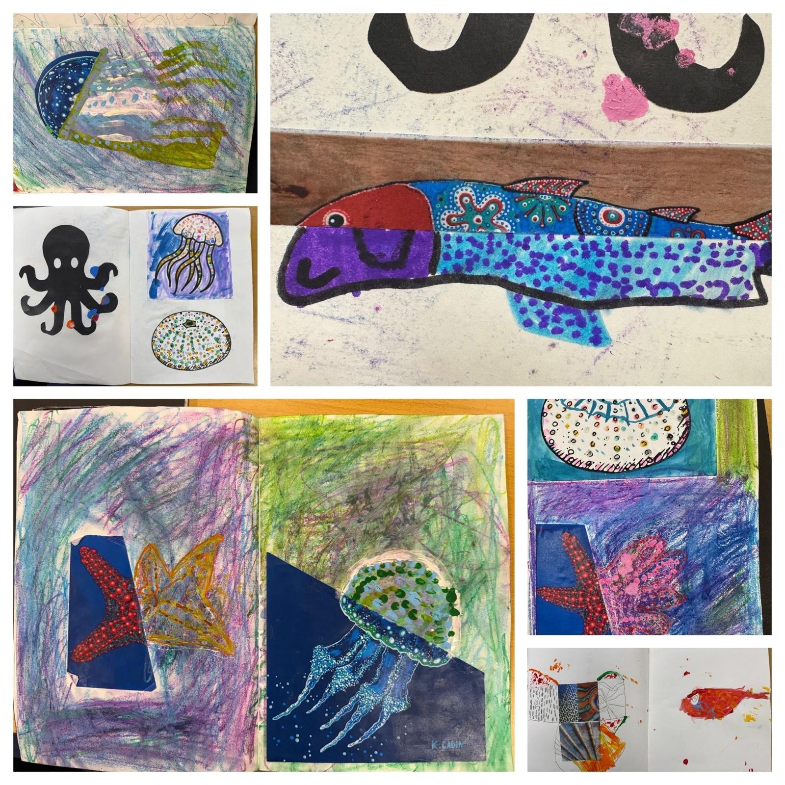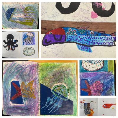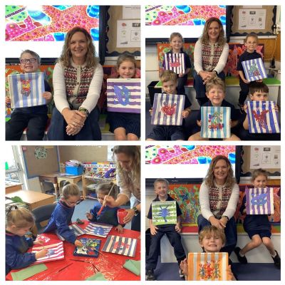 Year 1 loved having artist Katherine Cardin into class to help them create their individual final pieces in her style. The children had prepared by practising different techniques, experimenting with colour and drafting and redrafting detailed drawings of sea creatures. When asked, the children said “Having a real artist in our class was really exciting” and “she showed us new techniques with different parts of brush” and “helped us be brave with your art and persevere with the dots”. Thank you Katherine Cadin Art