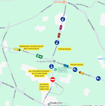 Rue de Sud will remain clear as an emergency route and parents are asked not to approach from this direction